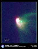 Object Name: Two Jets from Protostar L1551-IRS5 Telescope: Subaru Telescope / Cassegrain Focus Instrument: CISCO Filter: J(1.25 micron), K'(2.15 micron) Color: Blue(J+K'), Green (J), Red (K') Date: UT 1999 Jan 14 Exposure: 160 sec (J), 22.5 sec (K') Field of View: about 1 arcmin Orientation: North up, east left Position: RA (J2000.0)=4h31m34s, DEC (J2000.0)=+18d8m5s (Taurus) |