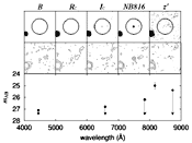 東北大学の谷口義明 (たにぐちよしあき、助教授) さんらは、国立天文台、東京大学、ハワイ大学、メリーランド大学らの研究者と協力して、波長が810~822ナノメーターのみの光を通すフィルター (NB816) をすばる望遠鏡の広視野撮像カメラ Suprime-Camに取りつけました。この波長帯では地球大気の夜光が弱いので、34分角x27分角と満月が入るほどの大きな視野を備えた Suprime-Cam とこのフィルターの組み合わせは、遠方の銀河を探査するために最適な組み合わせになります。宇宙が誕生して間もないころの銀河が発するライマンα線 (水素原子が放射するスペクトル線、波長122ナノメートル) は、赤方偏移により、開発したフィルターが通す波長800ナノメートル付近の光として観測されるはずです (期待される赤方偏移は約5.7です)。