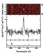 図 2 : ケック望遠鏡のESIによる LAE J1044-0123 のスペクトル。上は 世界時2002年3月13日。非常に細い輝線がはっきりととらえられており、その幅から、ライマンαであることがわかる。 |