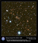 Object: Galaxy Cluster RX J0152.7-1357 Distance: Approximately 7 billion light years Telescope : Subaru Telescope (Effective Diameter 8.2m) Focus: Prime Focus Instrument: Suprime-Cam Filters : V (0.55micron),R (0.65micron), i' (0.77micron) Color Composition: Blue =V, Green = R, Red = i' Observation Date: UT, 26 Sep 2003 (V), 27 Sep (R), 26 Sep (i') Exposure Time: 120min (V), 116min (R), 75min (i') Field of View: 3arcmin x 3arcmin Orientation: North up, East left On Sky Location: Constellation Cetus |