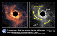 上記プロジェクトの一環として、ぎょしゃ座AB星 (AB Aur、距離470光年) と呼ばれる年齢約400万年の星を観測したところ、そのまわりの原始惑星系円盤が、中心の星からの赤外線を反射して輝いている様子をとらえることに成功しました (図2)。不思議なことに、その円盤は平らではなく、銀河で見られるようなうずまきの形(spiral arm)をしていることが明らかになりました。その腕は必ずしも一筆書きでたどることができず、非常に複雑な構造をもっています。円盤の明るさの分布と、過去の電波観測から得られていた円盤の回転方向とを考え合わせると、銀河と同じように、腕を引きずって回転するようなうずまき円盤であることがわかります (図3)。星と円盤の周囲に残る密度の薄い塵を見通して観測できる赤外線波長で、しかも0.1秒角以下という高解像度で観測したことにより、円盤の微細な構造が初めて直接に見えてきたわけです。