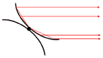 (図2-2) うずまき状の円盤を横から眺めた模式図 中心星からの光が円盤の表面で反射している様子を表す。 |