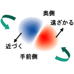 (図3) うずまき状円盤の運動 赤外線の撮像観測だけではうずまき状円盤の運動はわからない。しかし、左下が明るいことは、円盤の左下部が手前側、右上部が奥側に傾いていることを示している。いっぽう、過去の解像度の低い電波観測では、円盤の形状はピンボケだが、その運動は推測できる。それによると、円盤の左上 (青の部分) が地球に近づき、右下 (赤の部分) が地球から遠ざかる運動をしている。よって、今回観測されたうずまき状の円盤は左下が手前側に傾き、左上部分が地球に近づく運動をしている、すなわち腕を引きずる向きに回転していることがわかる。 |