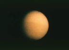 探査機ボイジャーが撮影したタイタン。完全に厚い大気の層に覆われています。大気は約95%が窒素で、残りはメタンなどの炭化水素やシアン化水素などから 成っています。