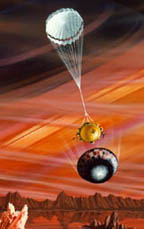 このイメージは、ホイヘンスがタイタン表面に到達した時の様子です。 探査機カッシーニ (画像の左上隅に見える) は、ホイヘンスに高指向性アンテナを向けながら飛行しています。メタン、エタン、そして (大部分) 窒素から成るタイタンの厚いの大気を通して、土星が見えます。薄いメタンの雲は地平線に点在し、狭いメタンの水源から 「メタンの滝」が左手の崖から流れ、そのほとんどが途中で蒸発してしまうでしょう。滑らかな 氷は、メタンやエタンの湖から隆起し、クレーターの壁も遠くに見えています。 (デイビット・シールによるイメージ図) Credit: David Seal/NASA