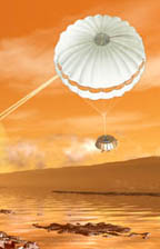 タイタンの地表には、ところどころメタンやアンモニアの薄氷に覆われ た、エタンとメタンの液体から成る湖が存在するかも知れません。タイタンの大気や地表に ある、より重い炭化水素のため、全体が茶色身がかったオレンジ色をしています。このイメージでは、探査機の大きさや氷の構造、土星のリングの傾き、厚い大気を通してみた土星 が誇張して描かれています。 Credit: NASA/JPL/Caltech |