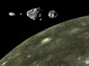 図2 木星の内側を回る小衛星とカリスト 探査機ガリレオが撮影した、木星の内側を回る4つの小衛星とカリスト。上部左からメチス、アドラステア、アマルテア、テーベとカリスト (衛星の大きさは、ほぼ正しい比率で示してある)。アマルテアの形は不規則で、大きさは 270 x 165 x150 km と九州がほぼ入る大きさである。表面物質は、カリストの氷が少ない領域と非常に似ていることがわかった。 (衛星画像はNASA/JPL-Caltechより) |