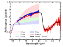 図4 アマルテア、テーベの反射率とカリスト、小惑星との比較 アマルテア (赤線),テーベ (青線) は、カリストの氷が少ない領域のスペクトル (黒線) と非常に良く似ている。波長 3 マイクロメートル付近に見られる深い吸収帯は、含水鉱物の存在を示している。波長2.5マイクロメートルまでのスペクトルは、木星の軌道付近に多く存在する D タイプ小惑星 (ピンク色の領域) とよく似ている。 |
