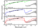 図5 アマルテアと隕石の反射率の比較 アマルテアの反射スペクトル (黒) と炭素質球粒隕石との比較。タギッシュ・レイク隕石 (a:緑線) は D タイプ小惑星がその母天体と考えられている。マーチソン隕石 (b:青線) とイヴナ隕石 (c:赤線) も太陽系初期の始原的な物質で出来ていると考えられている。イヴナ隕石の赤点線は、3マイクロメートルより長波長側を比較するために、スケーリングを変えたもの。 |