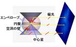 しかし、若い大質量星は非常に明るく、その星周構造を直接に見ることはできません。この問題は、光の偏りを測定すること (偏光撮像) により解決することができます。偏光は光の波としての性質のひとつで、光の進行方向と垂直に、どの方向にどの程度光が偏っているかを測ることができます。自然の (偏光していない) 光も鏡で反射すると、その電場ベクトルは入射光と垂直な方向に偏光します。同じことが、上記の、星・円盤・アウトフローからなるシステムでも起こります。星からの光は、円盤・エンベロープ・アウトフローが作った空洞の壁を照らしています。空洞には物質が無いので、星からの光はさえぎられずに進み、空洞の壁に当たったときに、反射され偏光が生じます。このときの偏光の度合いは大きくなります。いっぽう、円盤やエンベロープの密度は高いために偏光の度合いは下がります。このような理由で、図1のような構造が観測されています。図3および注2にさらに詳しい説明を記しました。