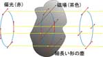 図4.平行な偏光ベクトルのパターンを生み出す吸収による偏光の模式図。 この図では、横向きの磁場がある場合を考えています。細長い塵は、磁場と垂直な縦方向に整列し、縦方向の偏光成分の光が選択的に吸収されます。その結果、塵を通り抜けた光は、横方向に強く偏光します。 (拡大画像) |