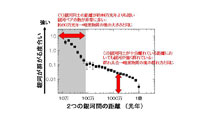 の中にあるとすれば説明がつきます。 精度はやや劣りますが、同様の結果は、本研究とほぼ同時に発表されており[8,9]、本研究の結果を支持しています。一方、(2) は従来の研究からも示唆されていましたが、銀河の数が少なく、大きな不定性が残ったままでした。本研究により、高い精度で確認することができました。この群れ方の強さは、「暗黒物質の塊」どうしの間のペアに対応するもので、数千億太陽質量くらいの「暗黒物質の塊」を仮定した理論的な予測[10]と合致します。