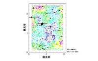 ![]() 図4:すばる望遠鏡で得た、かみのけ座のSDF天域における約120億光年彼方にある銀河の分布。色のついた丸が銀河を表す。銀河の密度の高いところほど赤く、密度の低いところほど青く表示しています。このような非一様な銀河の「群れ方」が、今回詳細に調べられました。