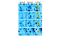 ![]() 図5:かたまって存在している約120億光年彼方の銀河(例)。 各段は3つのパネルからなり、同じ銀河の集まりのBバンド(波長0.45ミクロン)、Rバンド(0.65ミクロン)、i’バンド(0.77ミクロン) での画像を示す。1ミクロンは1000分1ミリメートル。120億光年彼方の銀河はi’バンド画像上で黄色丸で囲んだもの。「暗黒物質の塊」は、だいたいこの1つのパネル程度の大きさに相当します。