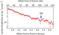 A similar analysis of how the amount of polarization changes with distance from the star shows a decrease in polarization at a distance of one hundred astronomical units (an astronomical unit is the distance between Earth and the Sun). (Figure 4) This corresponds to a location where the brightness also decreases, suggesting that at this distance from the star there are fewer planetesimals.
