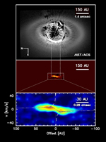 Figure 2: Photo-evaporation of a Disk Top: An image of HD 141569A from HST (Clampin et al. 2003 AJ,126, 385). The inner 200AU of the disk is masked. Middle: The spectral data combined into a single image showing the spatial distribution of gas and its velocity. The horizontal axis is the distance from the star and the vertical axis is the velocity. Bottom: A close up of the middle panel. The combination of a high-resolution spectrograph with adaptive optics technology allows access to the inner most part of the disk hidden behind the mask in the HST data. The size of the central opening in the disk suggests that photo-evaporation is responsible for its clearing. It is also possible that one or more planets could be sweeping up material as they orbit around the star. There is, as yet, no evidence for such planets. (Enlarge) |