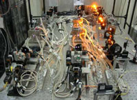 Note 3: The laser guide star system was designed to make more of the sky available to the adaptive optics system. Dr. Yutaka Hayano led the development and production of the system. Subaru's laser guide star system uses a high-output laser (tuned to the sodium D2 line at 589 nanometers) to excite sodium atoms in the sodium layer of Earth's atmosphere, about 90 kilometers in altitude. The excited sodium atoms then release 589 nanometer photons and act as an artificial star for measuring the atmospheric distortion of light. With this instrument, any part of the sky overhead can be observed with the adaptive optics system. For example, distant galaxies that are far away on the sky from any bright star can now be studied in detail. The sodium laser for the system was developed in conjunction with researchers from the Solid State Optical Devices Research Unit of RIKEN led by Satoshi Wada. The laser is produced using a special optical crystal to combine a 1319 nanometer Nd:YAG laser with a 1064 nanometer Nd:YAG laser to produce a laser that matches the wavelength of the sodium D2 line exactly. (See Note 7) The 589 nanometer laser produced in the laser room is sent to the sky from a 50-cm-diameter laser launching telescope (See Note 8) attached to the top of the Subaru telescope. A new type of optical fiber developed in Japan called photonic crystal fiber (See Note 9) was used to send the high-power laser light from the laser room to the laser launching telescope with minimal loss.