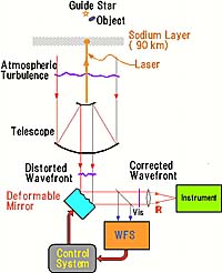 Figure 3: A schematic diagram of how the adaptive optics and laser guide star systems work. The adaptive optics system measures the distortion in the light from a guide star and then sends the light from the observing target to a deformable mirror whose surface shape is adjusted so that the distortions are removed from it upon reflection. (Enlarge) |