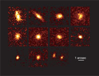 Figure1: Profiles and "frameworks" of galaxies from 11 billion years ago revealed by AO and IRCS at the Subaru Telescope. The high spatial resolution images are taken at the near-infrared light with wavelength of 2.0 micron. The white bar at the bottom right indicates the scale of 1 arcsec, which corresponds to 25,000 light years scale in the distant universe.