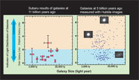 Thus far, research with the Hubble Space Telescope (HST) has lead studies into the profiles of distant galaxies. HST observations have revealed that galaxies seen in the local universe are similar to the galaxies observed 8 billion years ago, and the elliptical and disk type galaxies prevail in both eras. The important next step in this study of distant galaxies is to examine shapes of galaxies even further away at an earlier time in the universe. Subaru found a galaxy at 12.9 billion years ago, which is the farthest object found so far, using the wide field imaging camera. However, the difficulty with looking ever deeper into space is that more distant galaxies have smaller apparent size and smaller actual size, making their profiles difficult to distinguish. In response to these hurdles, astronomers used the sophisticated instruments and state-of-the-art technology of the Subaru Telescope to explore into galactic realms billions of light years away.