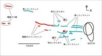 国立天文台と東京大学の研究者からなる研究チームが、すばる望遠鏡主焦点カメラを用いて、かみのけ座銀河団を観測し、銀河から延びるフィラメント状の不思議な構造を発見しました。この構造は若い星と電離ガスからなり、銀河団中の銀河RB199から南に約26万光年にわたって広がっています。あたかも銀河RB199からいくつものかたまりがまっすぐに飛び出しているかのような、その形態にちなんで、研究チームはこの構造を「火の玉 (fireballs)」と呼んでいます。かみのけ座銀河団に高速で落ちこんでいる銀河が、銀河団中心部を満たしている高温ガスと激しく衝突した結果、銀河内のガスがはぎ取られて、このような特異な構造を作ったものと考えられます。はぎ取られたガス中では星が生まれており、「火の玉」は銀河間空間で星を作る現場ともなっています。今回の発見は、銀河団中の銀河進化や、銀河間空間での星生成を探る上で重要な手がかりを与えると、研究チームは考えています。