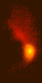 研究チームは、ケフェウス座のHD200775と呼ばれる若い星の周囲を、すばる望遠鏡の中間赤外線装置 COMICS を使って、波長 8-25 マイクロメートルの赤外線で撮影しました。 HD200775 は、地球から 1400 光年ほど離れたところにある、生まれたばかりの太陽の 10 倍ほどの質量の星です。この星が過去に行ったアウトフロー (ガスを星の極方向に吹き出す現象) 活動で作られた空洞があり、東西方向に伸びています。空洞の壁は分子ガスの密度が高くなった状態にあり、その最も星に近い部分は、 HD200775 の光に照らされて反射星雲 NGC7023 として輝いています。中心の星は実は連星で、少なくともふたつの星が軌道半径6.5AUで互いの周りを周りあっています。地球から見た連星の軌道は南北方向に伸びており、ちょうど連星軌道を公転面に近いところから見たために楕円形に伸びていることが分かっていました。