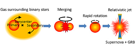 [4]: Conceptual diagram of the binary-star merger scenario. Binary stars are celestial objects consisting of a more massive star (primary) and a less massive star (secondary) that orbit a common center of mass. As the primary star evolves, its atmospheric layer expands and surrounds two stars. In this process, two stars move gradually closer to each other and finally merge. As the stars merge, the angular momentum associated with the orbital motion of the two stars (orbital angular momentum) remains. The merged star rotates rapidly and may become the progenitor of a GRB. Therefore, this scenario suggests that a GRB can occur even in a high-metallicity environment.