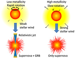 [2]: Conceptual diagram of GRB and supernova. The rapid rotation of a progenitor of a supernova and the formation of a gas disk near the progenitor's central region are necessary to make a relativistic jet (GRB). However, in this process, the stellar wind, which is material outflow from the surface of the progenitor, carries the rotating momentum (spin angular momentum) of the progenitor away. Thus the rotation velocity becomes slow if the stellar wind outflows a large amount of material before the explosion. How large the amount of material that the stellar wind takes away depends strongly on metallicity. If the metallicity is low, the stellar wind takes the small spin angular momentum of the progenitor away, which results in a star rapidly rotating before its explosion. If metallicity is very high, the stellar wind takes the large spin angular momentum, the progenitor does not rotate rapidly and is not likely to generate a GRB.