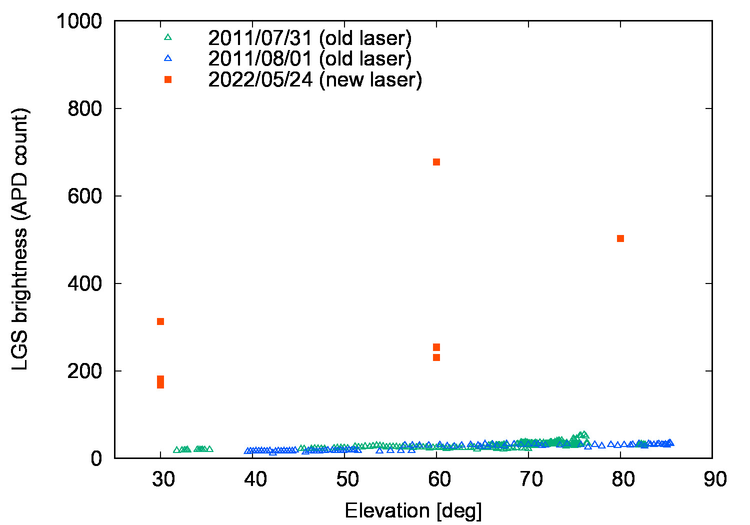 The new laser system is based on the TOPTICA laser and the optics are composed of mirrors, which provides the LGS with the brightness of 8.5 -- 10.0 mag in R-band (see figure below). The bright LGS will increase the stability of the LGS mode observations. The performance of the AO will be comparable to the old system since it depends on the ability of AO188. Please see the Performance page for the details.
