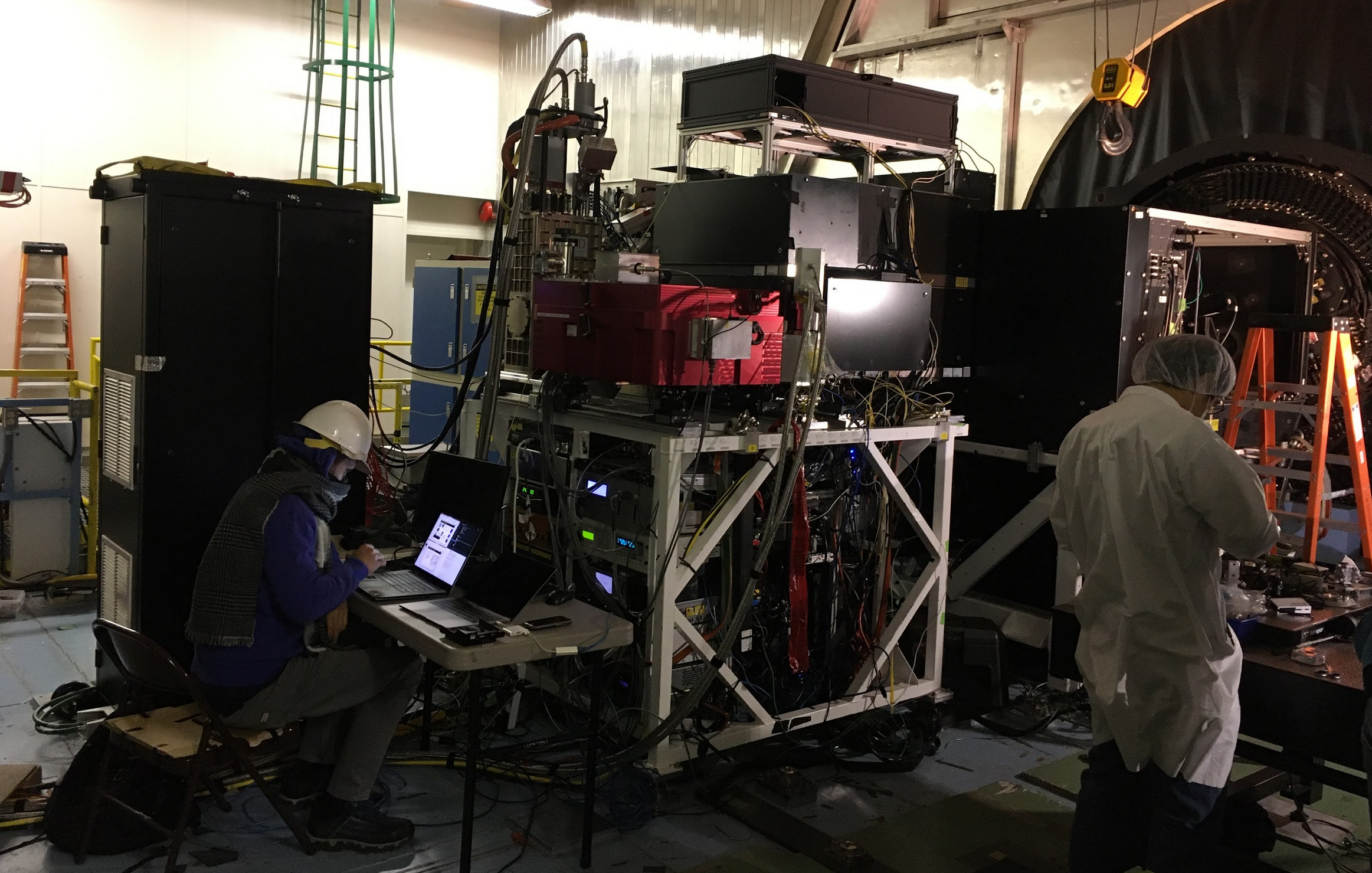 SCExAO (black stack of enclosures, center of image), CHARIS (flat red Dewar), and MEC (tall sliver Dewar) mounted on their support frame at the Nasmyth infrared (NasIR) platform undergoing testing. The NasIR platform provides a relatively comfortable environment for instrument maintenance and upgrades, allowing SCExAO to serve as both an open use science instrument and a technology validation system.