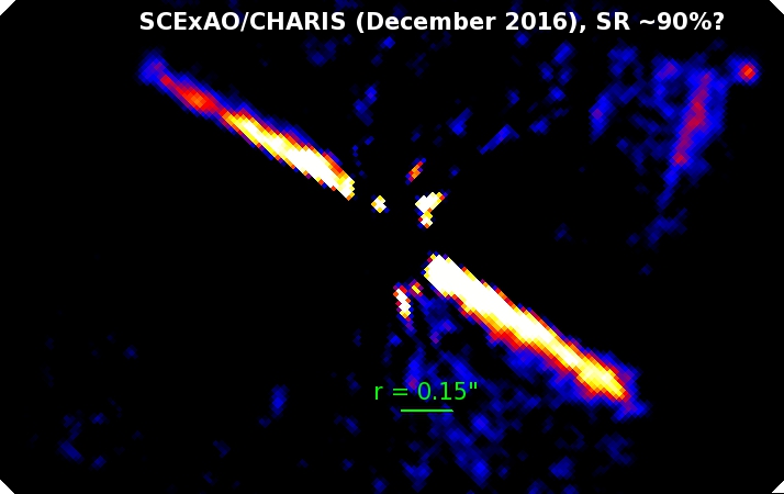 CHARIS data for HD 32297 reveal the disk down to ~0.1”—0.15” in a few minutes of integration time. (Data reduction performed by T. Currie) |