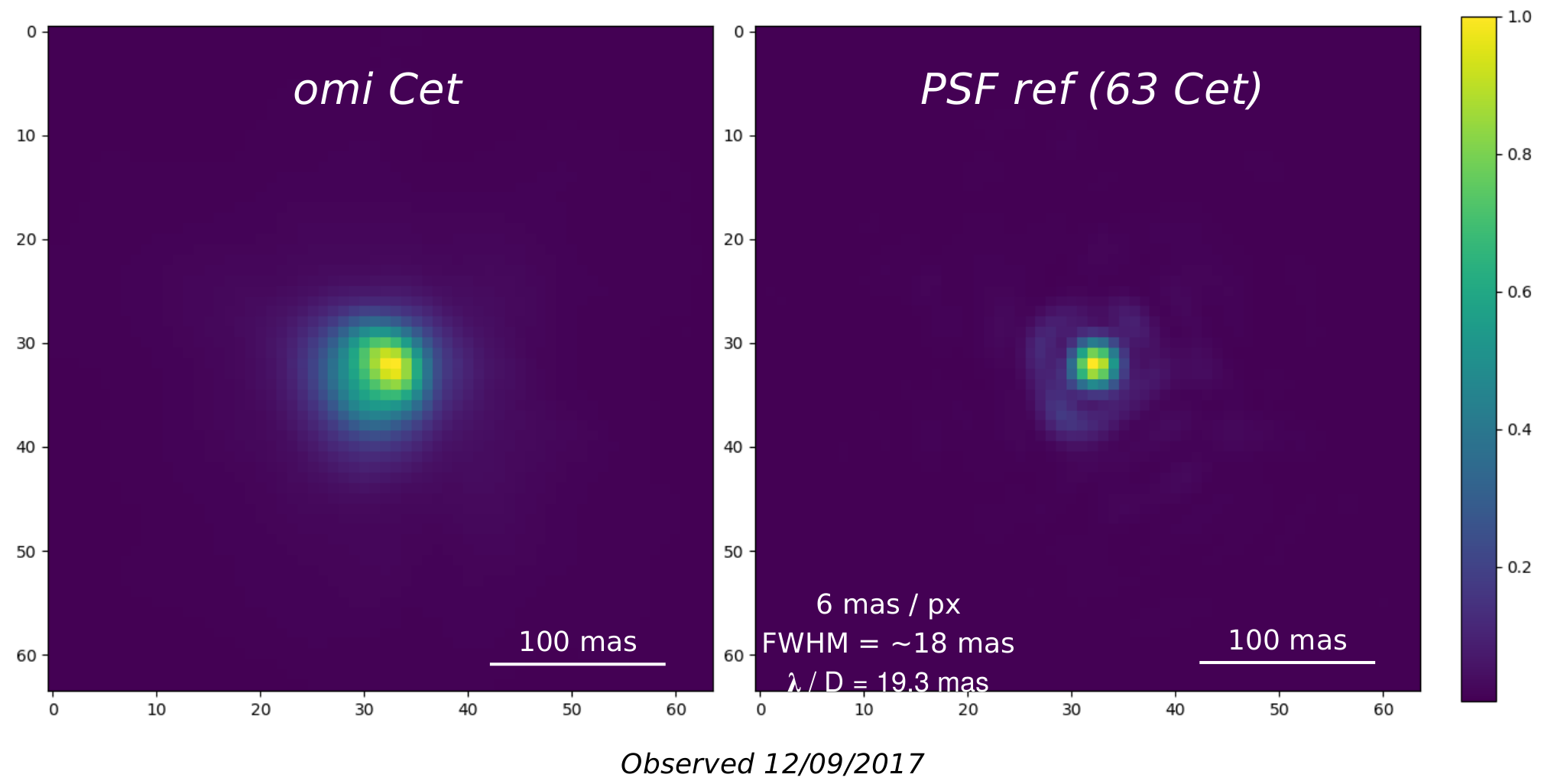VAMPIRES imaging of omi Cet (Mira) and comparison star. The star photosphere is clearly resolved showing