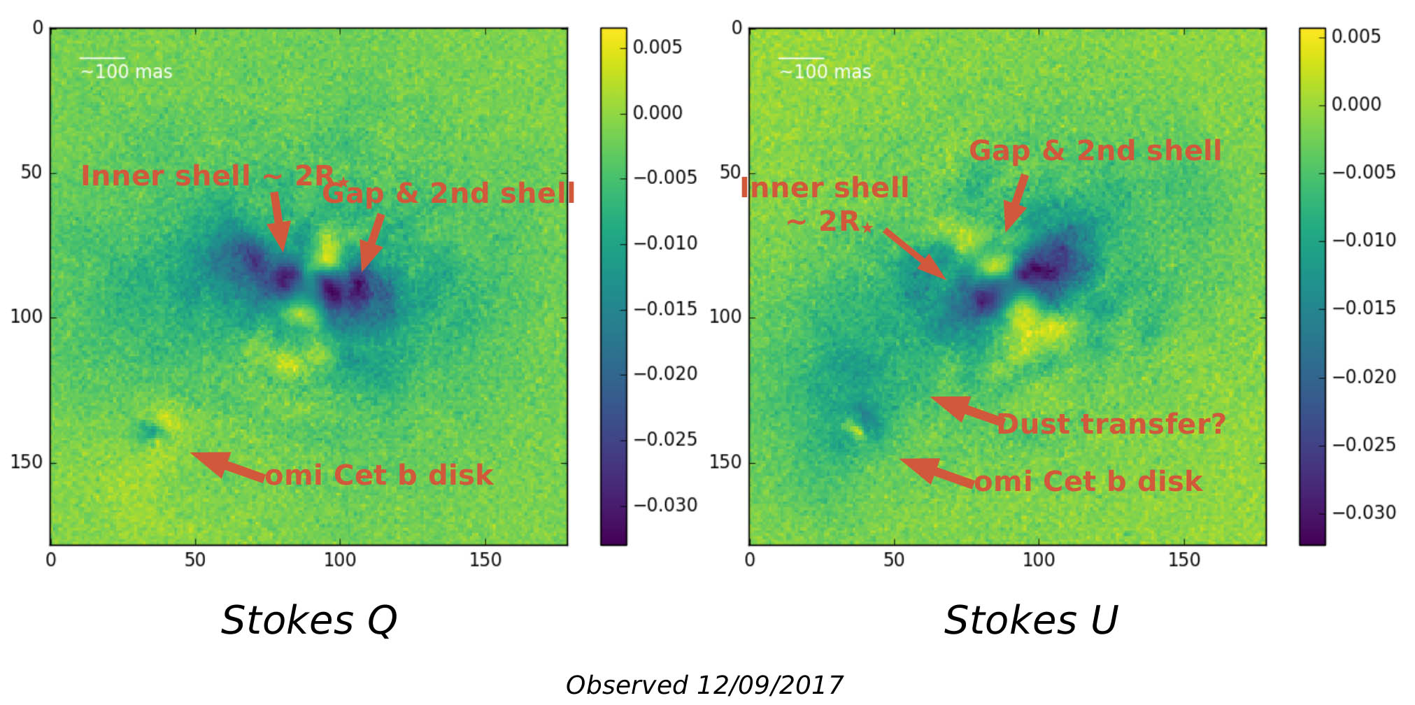 VAMPIRES imaging of omi Cet (Mira) in polarized light, revealing dust structures. (Data reduction performed by B. Norris) |