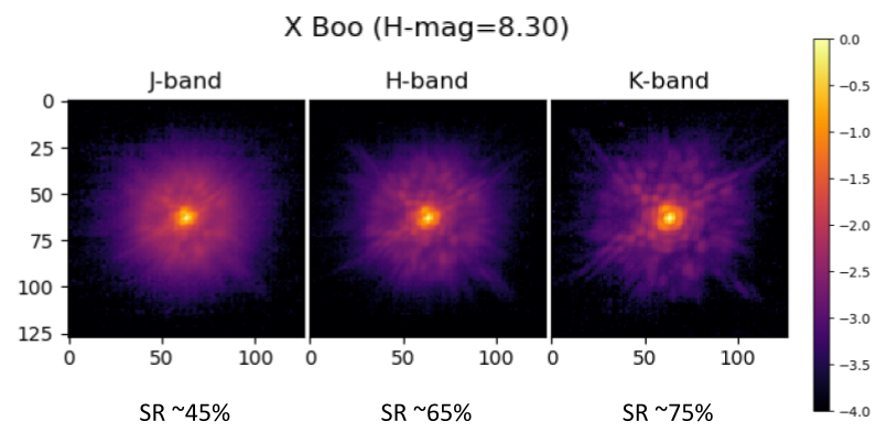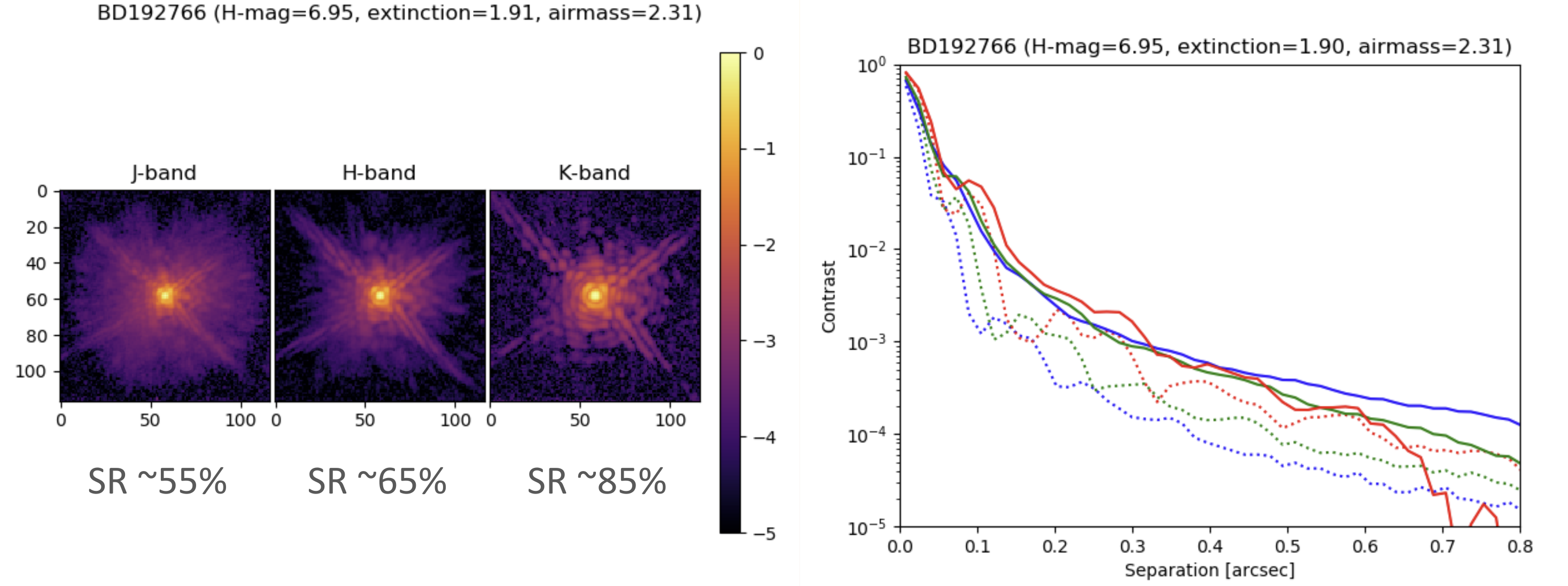 AO3k/NIRWFS observation of star Eps Boo (mH=0.13 before extinction) with CHARIS. Left: images and estimated Strehl ratios, Right: Radial profiles.