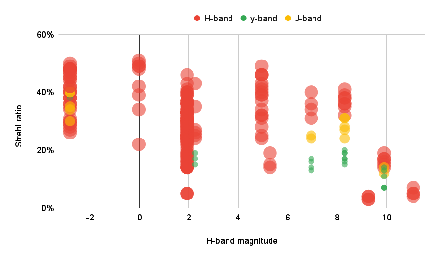 Strehl ratio is over 40% until magnitude ~9, then decreases. This was done with