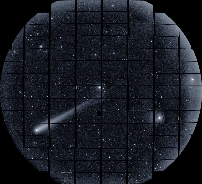 In the early morning of November 5, 2013 (Hawaii–Aleutian Standard Time, HAST), the Subaru Telescope observed Comet ISON (C/2012 S1) as it approached the Sun. Thanks to the combination of the Subaru Telescope and the Hyper Suprime-Cam (HSC), which offers an ultra-wide field of view, sharp stellar images, and exceptional light-gathering power, the observations captured even the faintest structures of the comet’s tail. This tail extended over one degree across the sky, approximately twice the apparent diameter of the full Moon, in the direction opposite the Sun.
