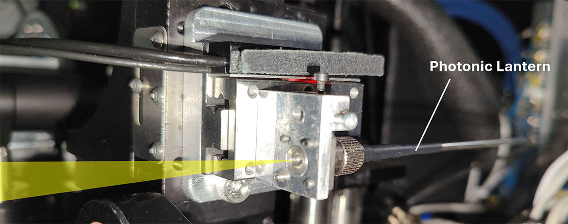 Figure 2: Photonic lantern, a specially designed optical fiber, mounted on the FIRST-PL instrument at the Subaru Telescope. The yellow triangle indicates the path of the light entering the lantern. (Credit: Sébastien Vievard/University of Hawai`i at Manoa)