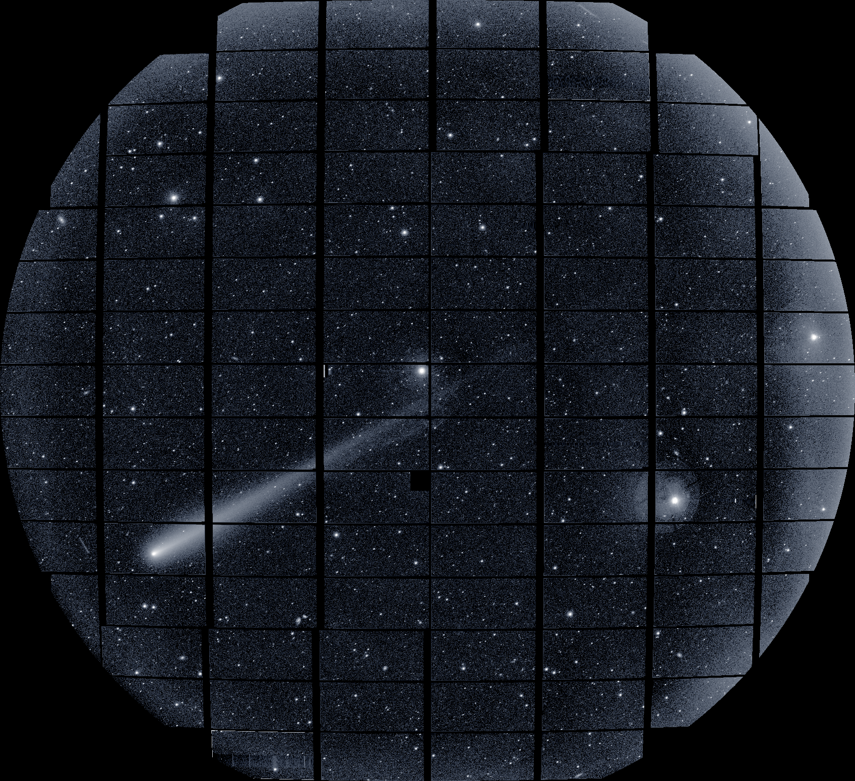 ハワイ現地時間2013年11月5日明け方、太陽に接近しつつあるアイソン彗星の姿をすばる望遠鏡が捉えました。すばる望遠鏡と超広視野主焦点カメラHSCとの組み合わせで達成される広い視野・シャープな星像・高い集光力により、太陽と反対の方向に1度角(満月の見かけの直径の約2倍)以上も伸びる尾を淡い部分まではっきりと写し出しています。