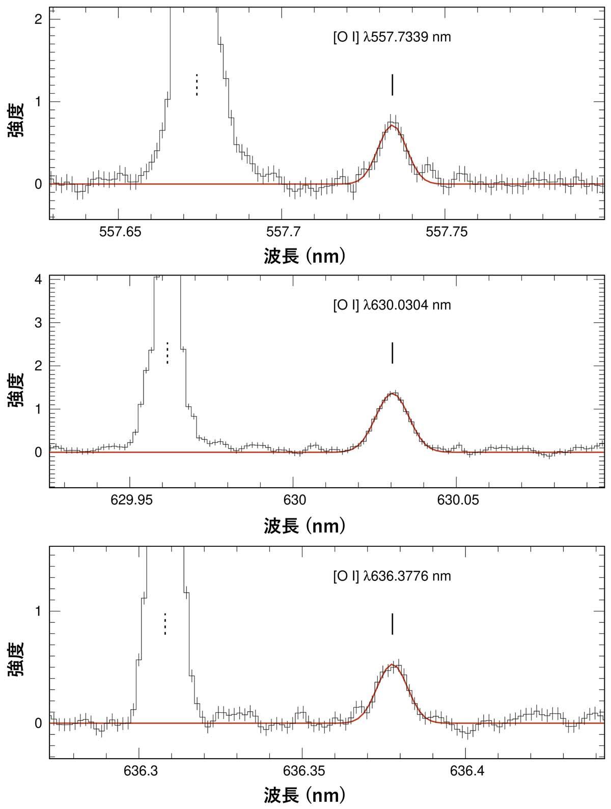 図3:アトラス彗星(3I/ATLAS、C/2025 N1)の3本の酸素原子禁制線のスペクトル。上から緑色輝線(557.7 ナノメートル)と2本の赤色輝線(630.0 ナノメートル、636.4 ナノメートル)を示します。各輝線の左側に見える輝線(点線でマーク)は地球大気の酸素原子禁制線です。高分散分光器 HDS で光を細かく分けることで、地球大気と彗星コマからの光を見分けることができています。(クレジット:京都産業大学)