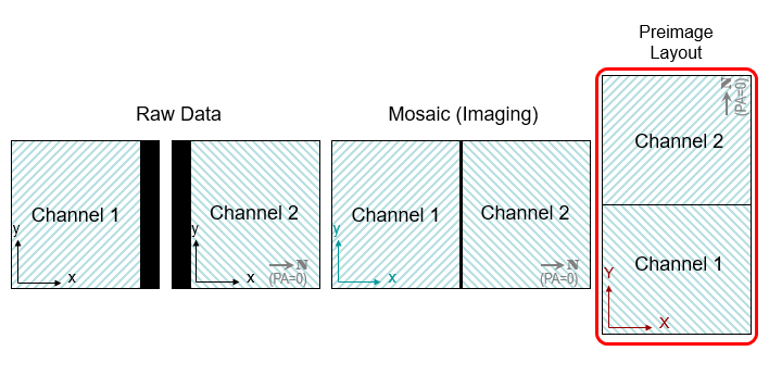 After we take your preimaging data, we will do a quick reduction and send them to you as soon as possible. The data reduction of the preimages is executed as follows. Firstly the raw data is flatfielded (by self-flats), sky-subtracted, and distortion corrected. After pasting each channel 1 and 2 data at the "shadow" region by the beam-splitting roof mirror to make a set of mosaic images, they are registered and median-combined. Note that the relative sensitivity difference between ch1 and ch2 may not take into account for preimage (though we may try). Then the resulting combined image is rotated to counterclockwise by 90 degrees so that the channel-2 image goes over the channel-1 image (which makes the image layout north is up and east is to the left under PA=0).