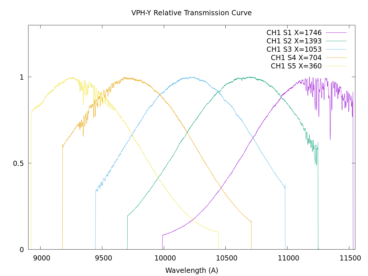 The important characteristic of these grisms is that the sensitivity curve will change with the X-position (in raw image coordinates) of the slit. The behavior for VPH-J, VPH-H and VPH-K is each shown in Figure 2. The peak efficiency value of the transmission curve is also known to change with X-position. The shift of the peak wavelength of the transmission curves is summarized in Figure 3.