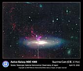 すばる望遠鏡の主焦点カメラ (Suprime-Cam) による観測で、NGC 4388 と呼ばれる銀河の周りに大きさが約 11 万光年もある電離した水素のガス雲を発見しました。画像の中で、銀河の中心から左上の方向に広がる紫色や赤色に見えているのが今回発見したガス雲です。この銀河は、私たちの銀河系からおよそ6000万光年離れた、おとめ座銀河団に属しています。今回のガス雲の発見は、銀河団内で集まっている銀河の進化を解明する手がかりになると期待されています。