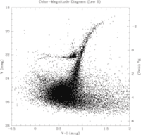 Figure 2: Color-magnitude diagram of Leo II. The horizontal axis is the color (V-Ic) and the vertical axis is the V-band magnitude of stars. As explained in the supplementary figure, stars trace the evolutionary track (main sequence -> sub-giant branch ->red giant branch -> horizontal branch) as they evolve and, hence, age of stars are estimated from the color-magnitude diagram. The color-magnitude diagram of Leo II resembles those of old Galactic globular clusters, suggesting that the majority of stars of Leo II are as old as those in the Galactic globular clusters. |