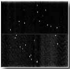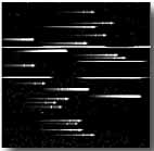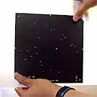 天体の位置にレーザー加工装置でスリットを空けたシートが次の写真です。一つ一つの細い線が、スリットです。上の画像に写る天体とシート上に空いたスリットの位置が一致していることがおわかりになるでしょう。