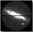 実際に MOS を用いた観測の例を見てみましょう。下の写真は、FOCAS の撮像観測による天体の画像です。中央の黒い線は、2 枚の CCD の境目に当たります。この画像に写っている天体の中から、分光観測を行う天体を選びます。
