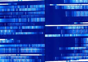 This multi object spectroscopy original data is from a single observation with MOIRCS (H+K band). Each barcode-like strip of light in the left and right side of this image is the spectrum of an individual object. This image shows the spectra of 31 different objects, one of the largest numbers of infrared spectra in a single observation. The barcode-like pattern is actually the spectrum of Earths atmosphere. The spectrum of the astronomical object is the faint line of light running horizontally through the middle of the barcode pattern. The thick, bright, continuous lines that run across either the left or right side of the image are from holes in the mask for aligning the mask with the position of stars. (Click here for a diagram of the Multi Object Spectrograph.) |