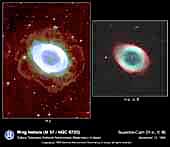 Object Name: Ring Nebula (M57, NGC 6720) Telescope: Subaru Telescope / Cassegrain Focus Instrument: Suprime-Cam Filter: H alpha(0.65micron), B(0.45micron), V(0.55micron) Color: Blue (B), Green (V), Red (H alpha) Date: UT1999 May 14, 23; June 15 Exposure: 25 min (H alpha), 6 min (V), 40 min (B) Field of View: 3 x 4 arcmins Orientation: North up, east left Position: RA(J2000.0)=18h53m36s, Dec(J2000.0)=+33d02m00s (Lyra) |