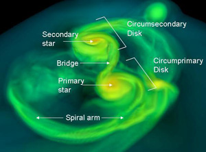 Our understanding of the creation and development of stars and planets has advanced substantially in the past two decades. Research has confirmed that new stars are often surrounded by disks of dense gas (“protoplanetary disks”) from which planets are believed to form; the radii of these disks can extend distances up to several hundreds times farther than the distance between the Sun and the Earth. Scientists have intensively studied the structure of protoplanetary disks at various electromagnetic wavelengths, and our knowledge of the mechanisms of single star formation has increased considerably. Nevertheless, most stars form in binary or multiple (more than two stars) systems, and many unanswered questions remain about how they are born and develop (see Figure 2 for a numerical simulation of binary formation and Figure 3 and the movie for the birth of a binary system). Consequently, studies of protoplanetary disks in binary and multiple systems are essential for making generalizations about the processes of star and planet formation.