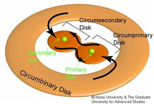 The July 2006 observations of the young binary star SR24 by astronomers Dr. Satoshi Mayama (The Graduate University for Advanced Studies or SOKENDAI), Dr. Motohide Tamura (National Astronomical Observatory of Japan or NAOJ and SOKENDAI), Dr. Masahiko Hayashi (NAOJ and SOKENDAI) and colleagues have corrected this deficit and provided data that can be used to test theories about binary system formation. The team captured a high-resolution, near-infrared image of the circumprimary and circumsecondary disks of SR24, the first such image of twin protoplanetary disks around a young stellar object (Figure 1A, Figure 4). They also discovered a long spiral arm extending out from the circumprimary disk, another first in observations of young stars. The image shows a bridge of gas connecting the two disks. The observations provide the first data that can be used to test theoretical models of mass accretion in binary systems.