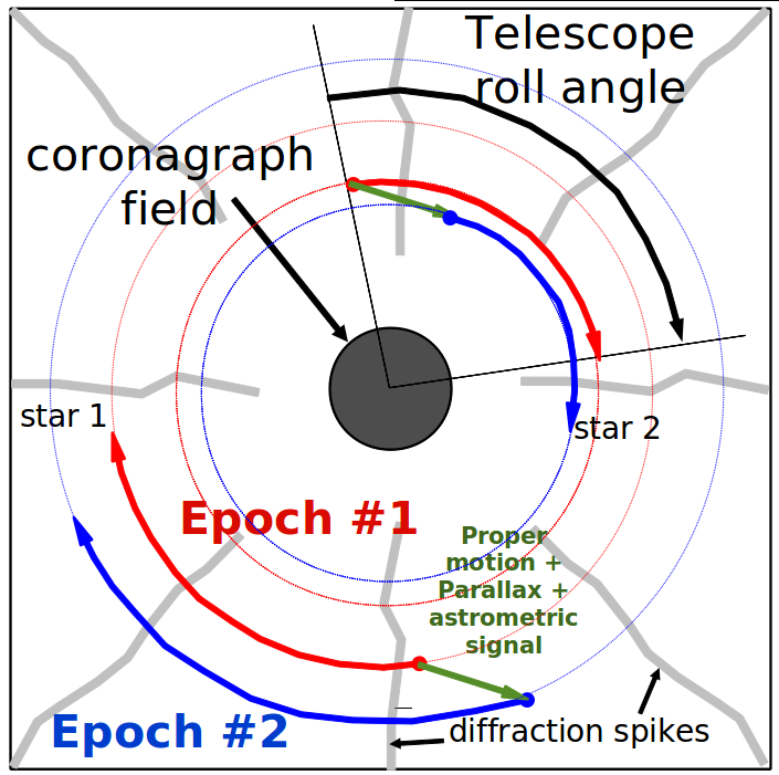 Large scale distortionsThe images of the diffraction spikes acquired on the same target at different observation epochs are compared to measure how large scale astrometric distortions change between epochs. These distortions are removed from the measurement of the background star motion between epochs.
